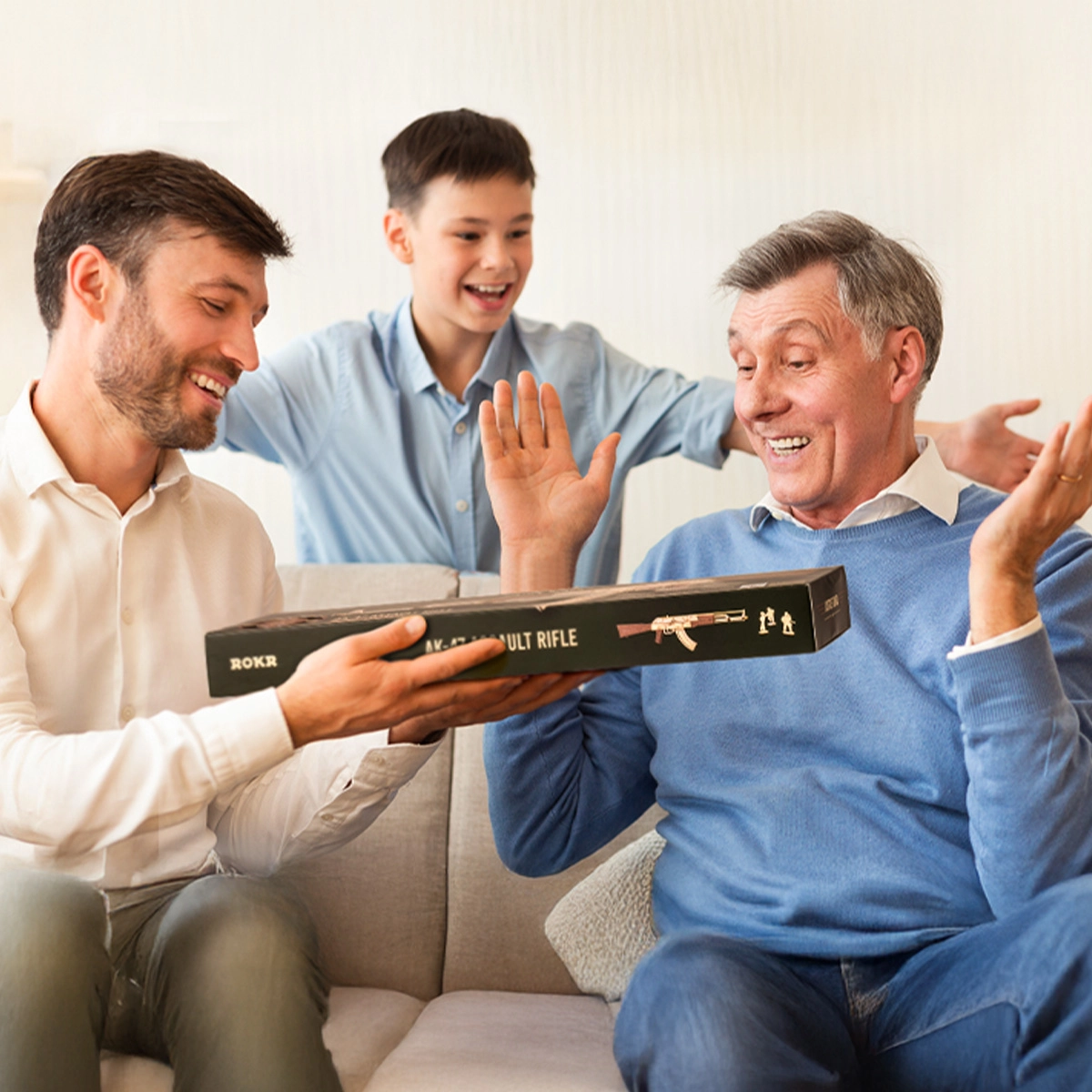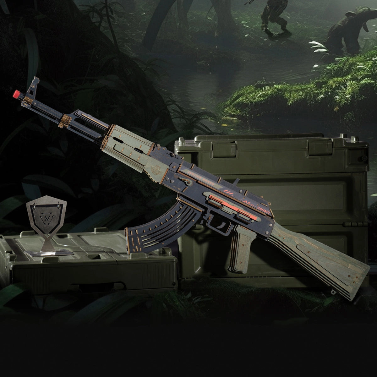 Simulate real authentic firearm action with the ROKR AK-47 wooden toy gun: Experience rubber band bullet shooting and safety play! *This toy gun is intended solely for play, ensuring safety and harmlessness.